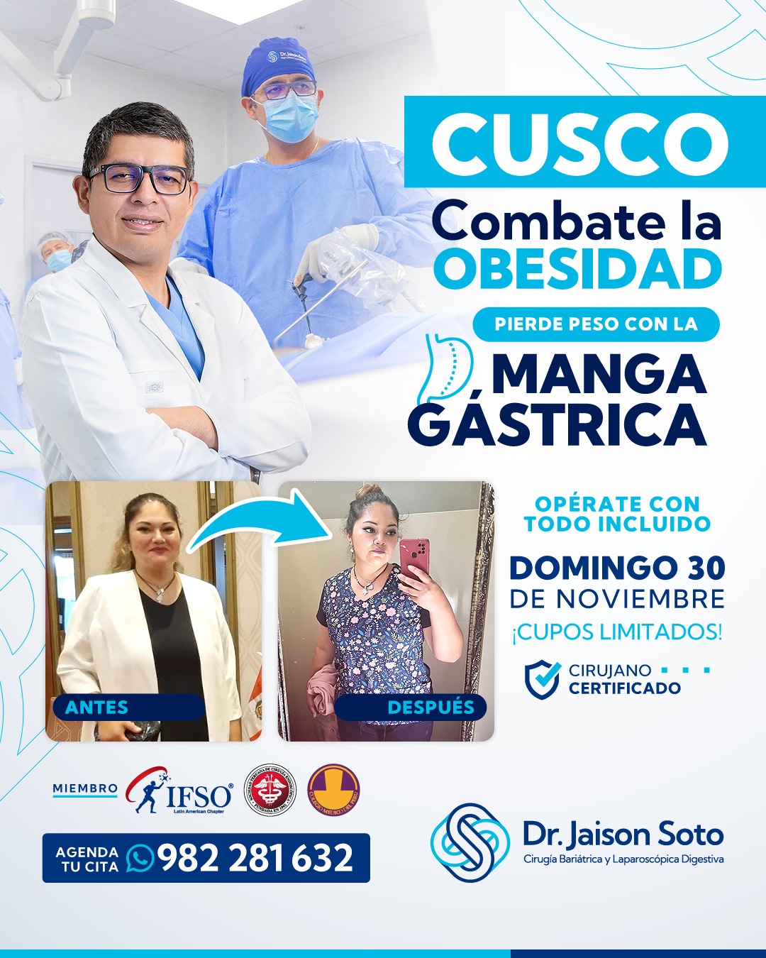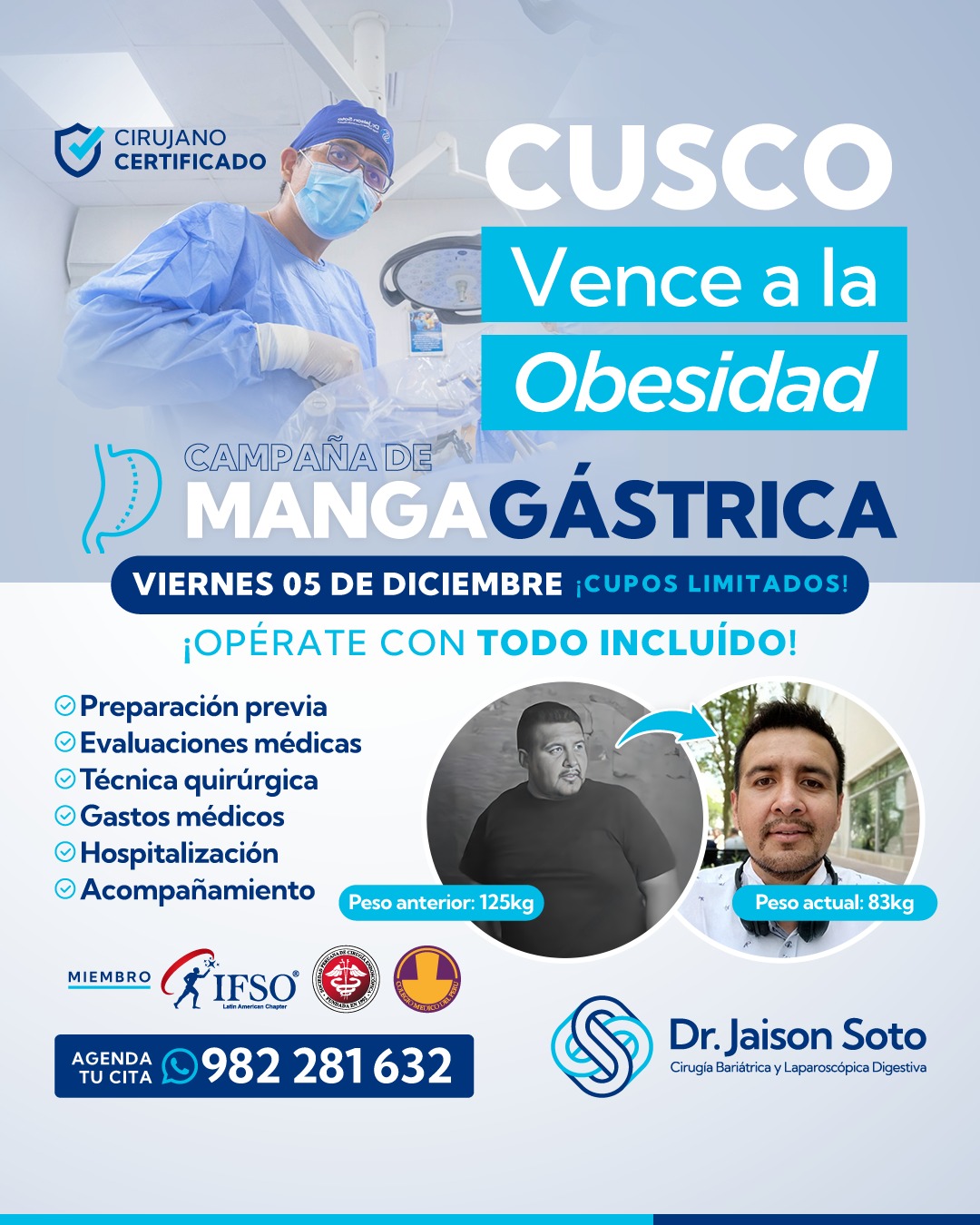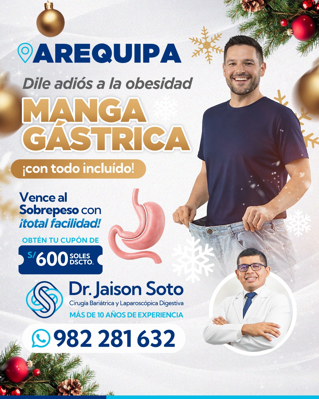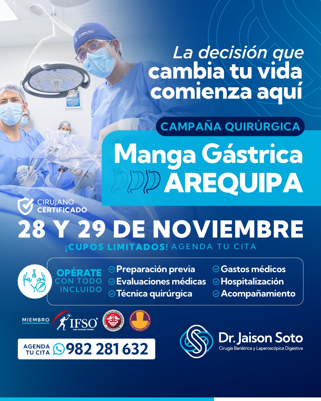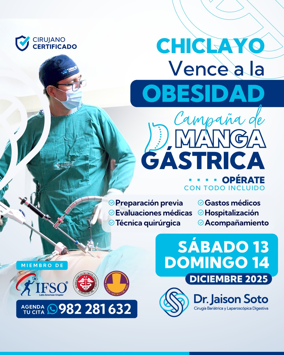 Con una sólida experiencia en cirugía bariátrica y laparoscópica avanzada, el Dr. Jaison Soto es un destacado médico cirujano. Actualmente, presta sus servicios en el Hospital Nacional Arzobispo Loayza y en la Clínica de la Obesidad, Cirugía Bariátrica.